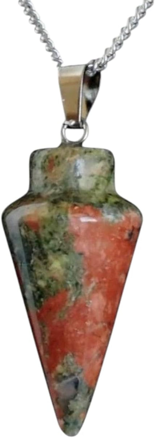 Discover the mystical allure of these stunning pendulum-shaped crystal necklaces, each featuring a unique natural stone pendant. The collection includes an array of captivating colors - from serene blue and earthy orange to calming green, mesmerizing blue-white marbling, gentle pink, pristine white, and sophisticated gray. Each pendant is expertly crafted into a sleek cone shape and comes complete with a 925 sterling silver plated chain for easy wearing. The natural variations in each stone make every piece one-of-a-kind, perfect for those seeking distinctive jewelry that connects with their personal style. These eye-catching pendants make wonderful accessories for both casual and dressy occasions, adding a touch of natural beauty to any outfit. The durable metal findings and quality chain ensure long-lasting wear, while the polished stone surface highlights the unique patterns and colors within each crystal.
